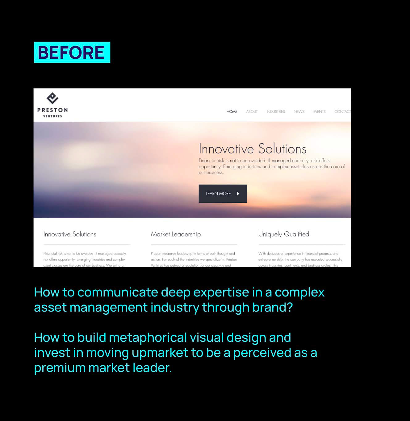 Position the company as a leader in the category of financial longevity and innovative asset management. Rebuild the existing business perception, with new brand positioning. Business optimization, website UX and sales team presentations.
